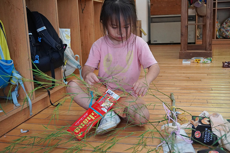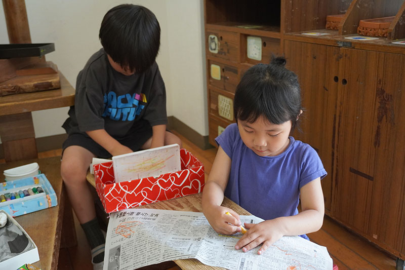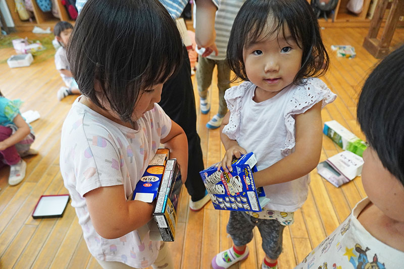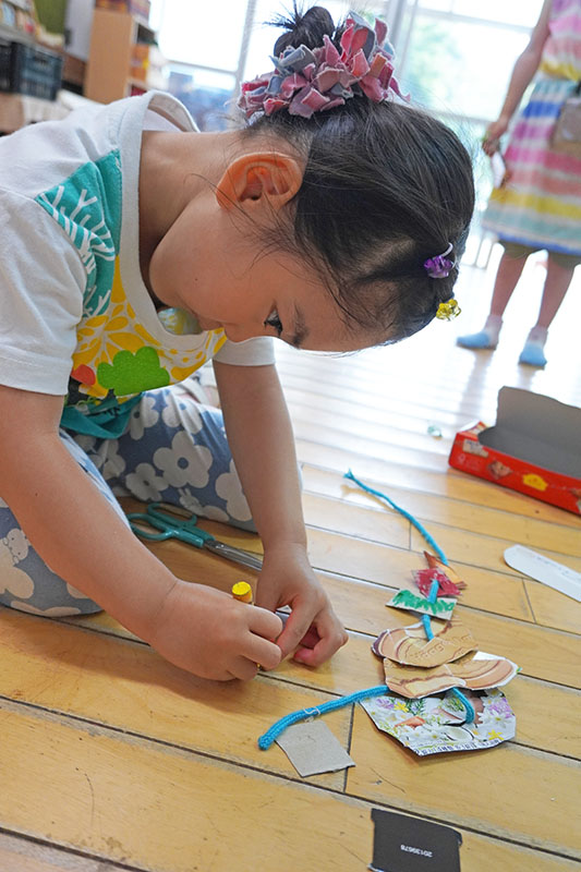 好きな箱や紐、紙を選び、ハサミやのり、クレヨンを使って、思い思いに作っています。