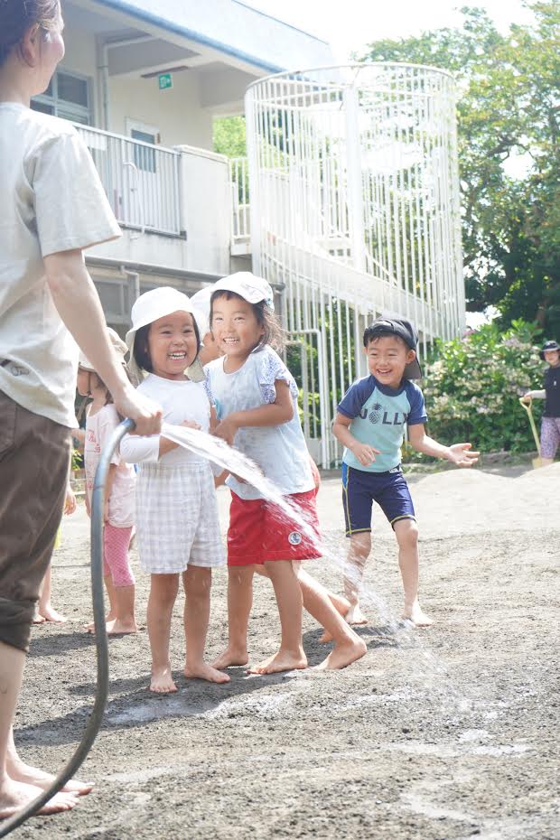 みんなの足元が涼しくなるように、と撒いてくれる水に、子どもたちは大喜び。