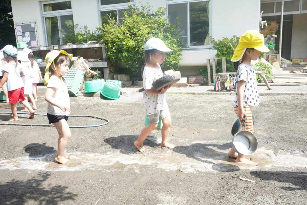 少しクールダウンした園庭に、いつものようにあそび道具を持って、水の道を歩きます。