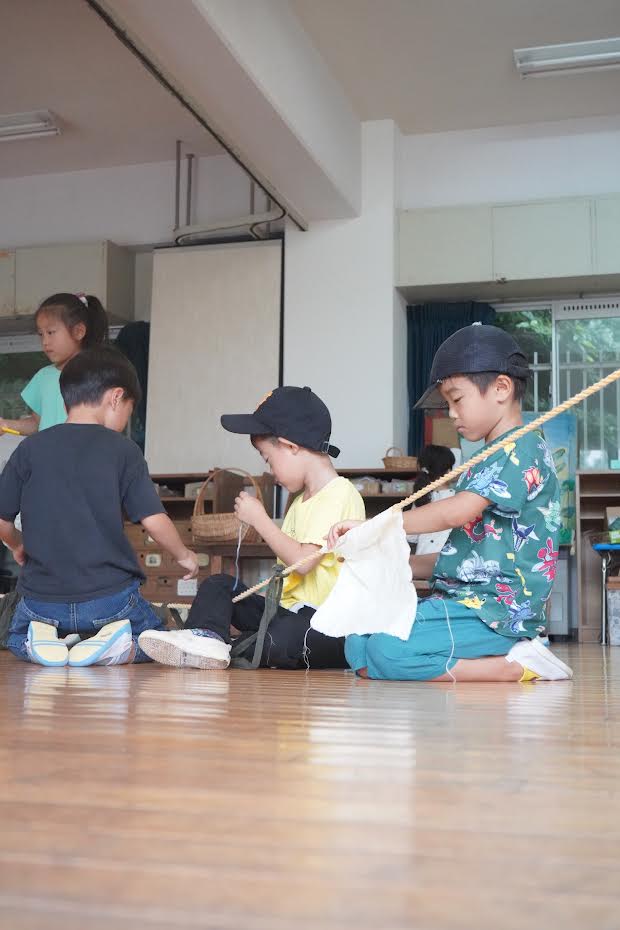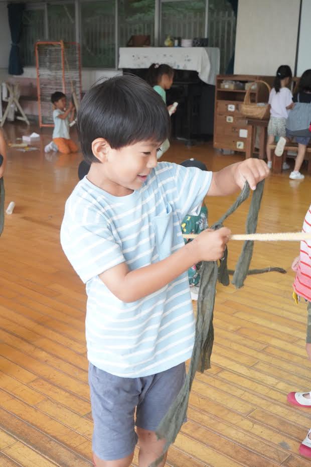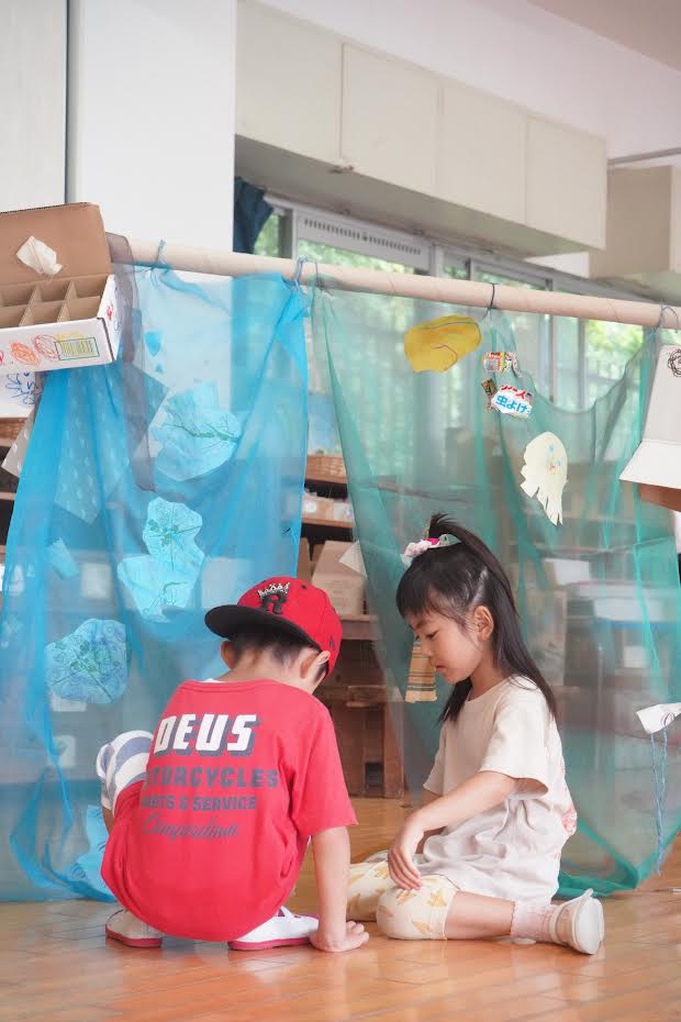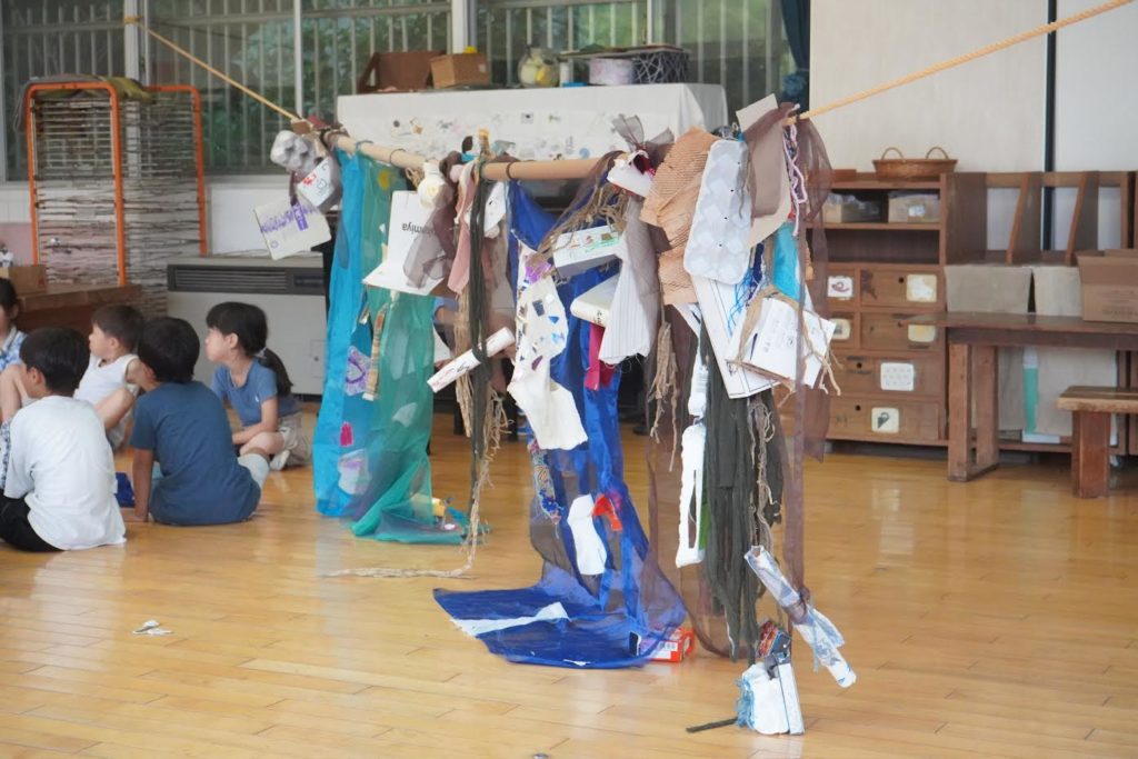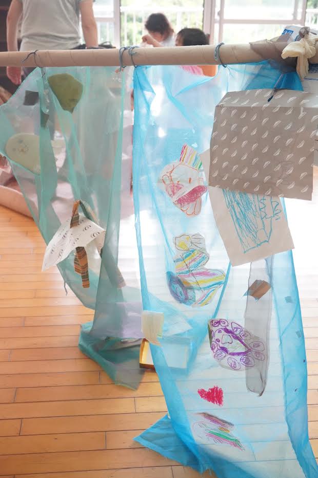 ”海藻のカーテンを作りたい!”。男の子と女の子で着替える所を分けるために一工夫。
