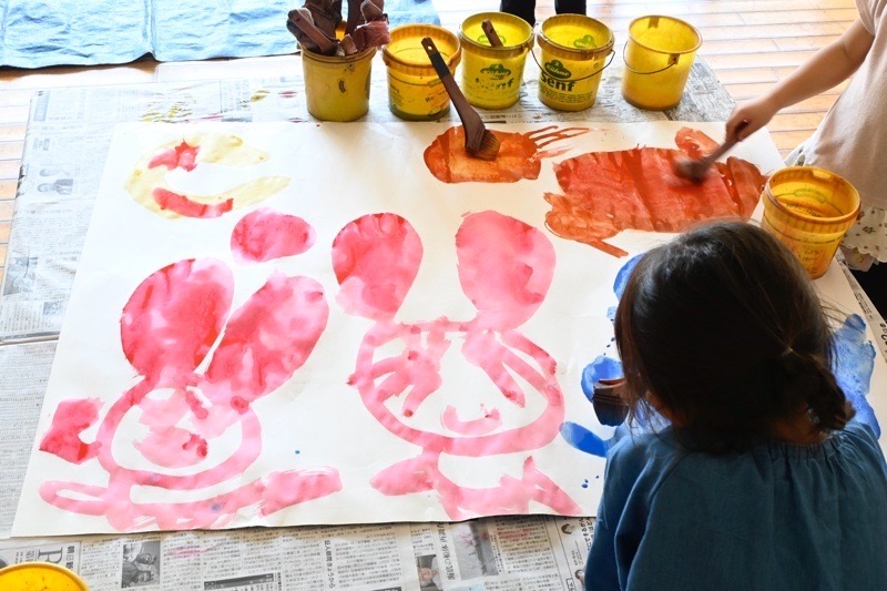 ということで、今度は2階のホールで大きな紙にえのぐで絵を描いていましたよ。