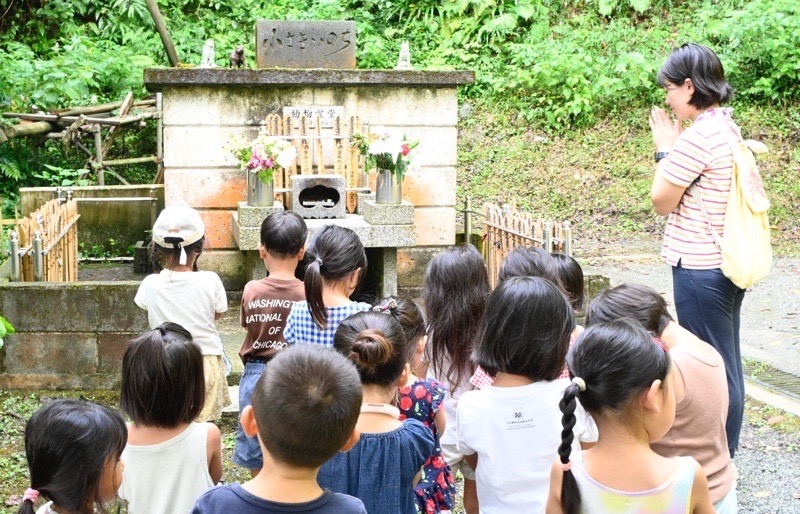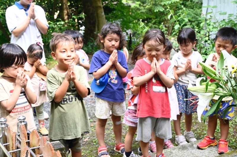 幼稚園で死んでしまった、おたまじゃくしやだんごむしのことを想い、手を合わせます。
