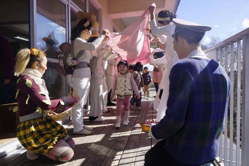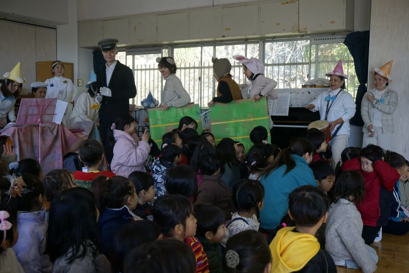 さよならパーティーの内容は、原案、脚本、演出、振付、全てきいろ母さんでつくり上げた舞台『思い出列車の旅がはじまる』でした。きいろの子の新しい出発へ励ましのパワーを贈れるような場にしたい、と考えられた舞台はハンドベルの優しい音色で幕を開けました。