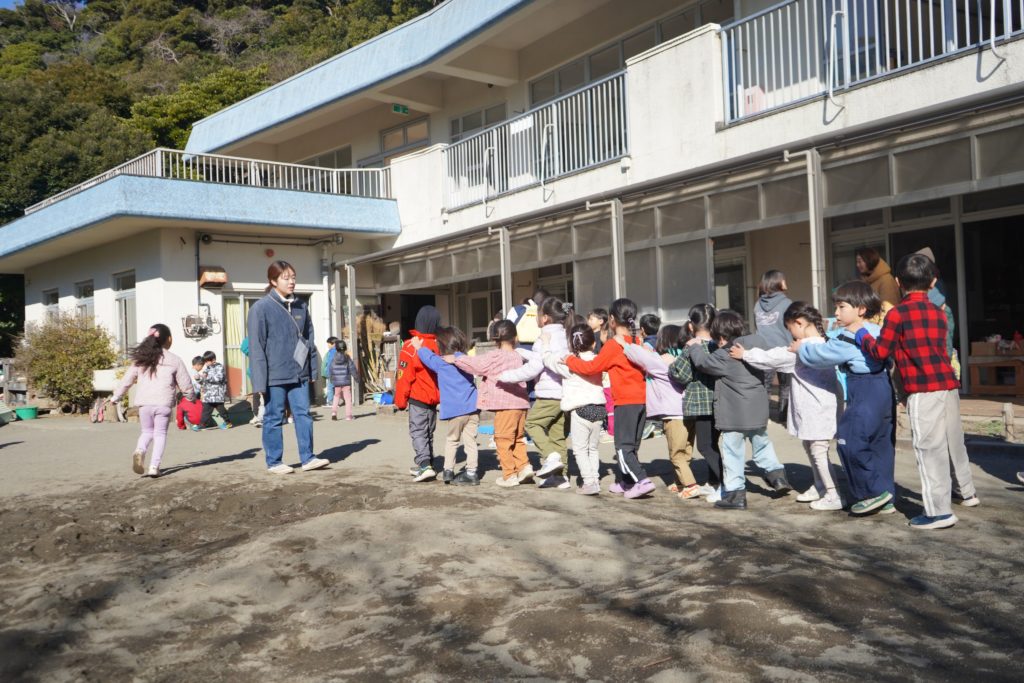 声を掛け合って、手をつないで、歌を口ずさんで。普段とはちょっと違う遊びで賑やかになる園庭を、部屋で遊んでいた子たちも手を止め様子をみていました。
