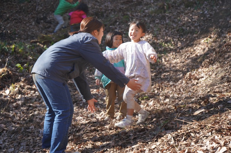 今度は下にいる保育者に「受け止めてー!!」と子どもたちが次々に保育者に向かって飛び込みはじめ、受け止めてはふかふか落ち葉のおふとんへ運ばれる場面も。