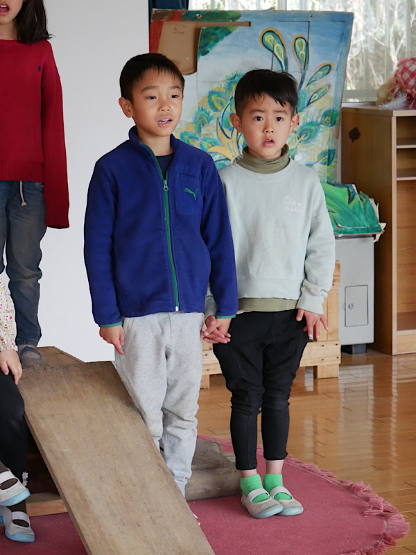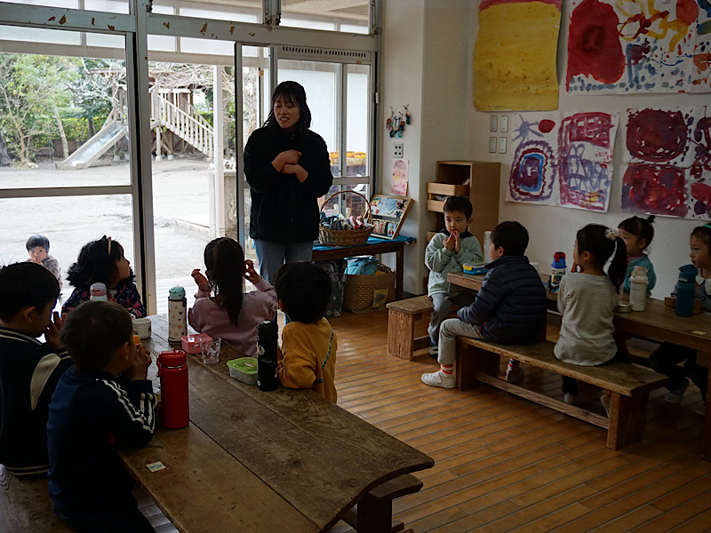 保育者から、14年前の3月11日に大きな地震があって、食べるものにも困った人がたくさんいたので、今日は、いつものお弁当と違ってお腹がすいちゃうかもしれないけど、おにぎりだけのお弁当をみんなで食べよう、というお話がありました。