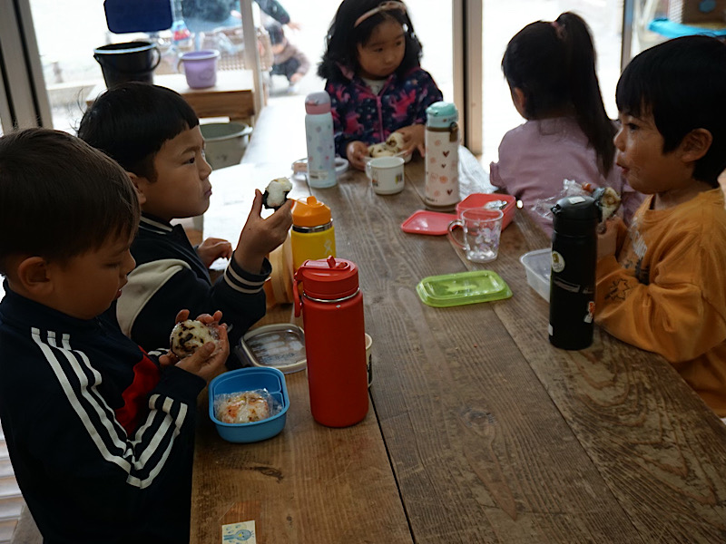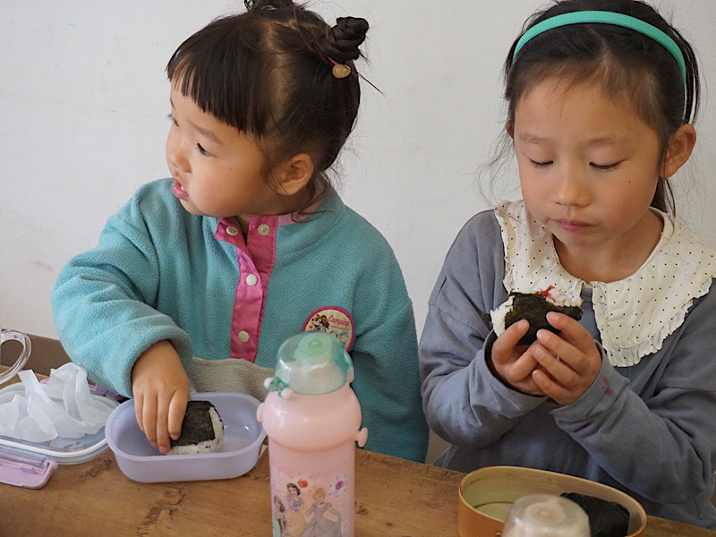 子ども達は、手を合わせて、「のの様、いただきます」をしたあと、それぞれおにぎりを食べはじめました。