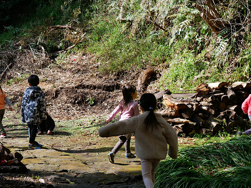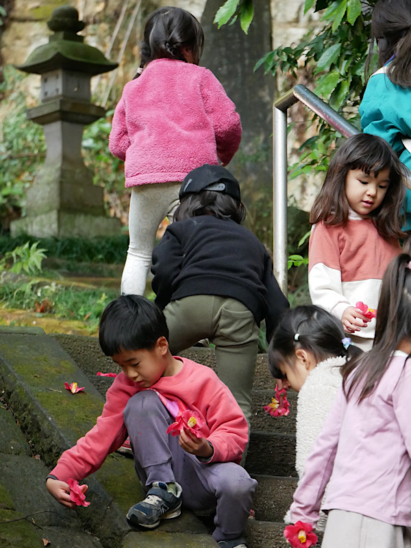 保育者とは山門で別れ、山門で待ち合わせ。はなの子たちの「ぼうけん」です。(「声でどこにいるかわかりますね」と微笑みながら、信じて待つ保育者の姿が、印象的でした。)
