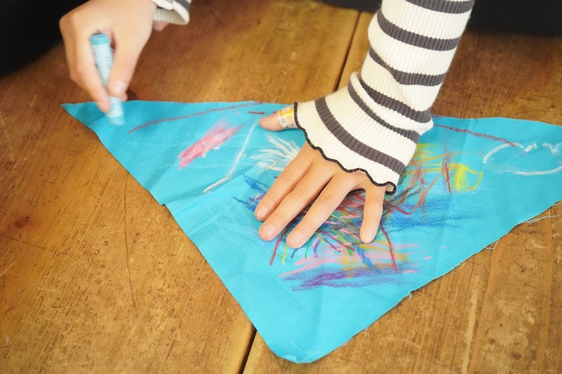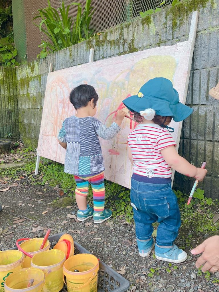 ゆっくりお散歩を楽しんだあと、隠れていた絵の具が登場!みんなニコニコで筆を取ります。