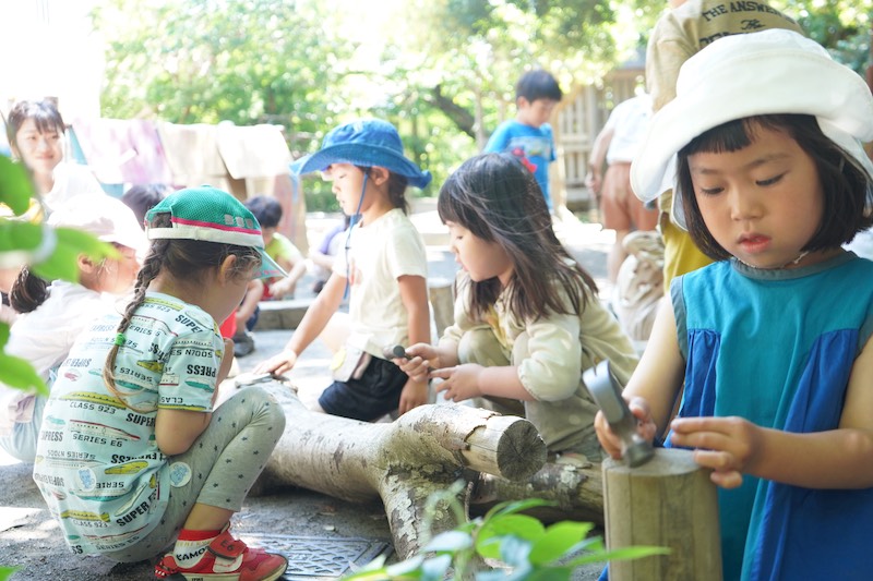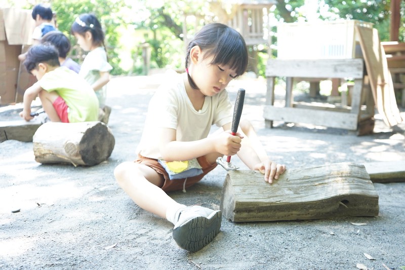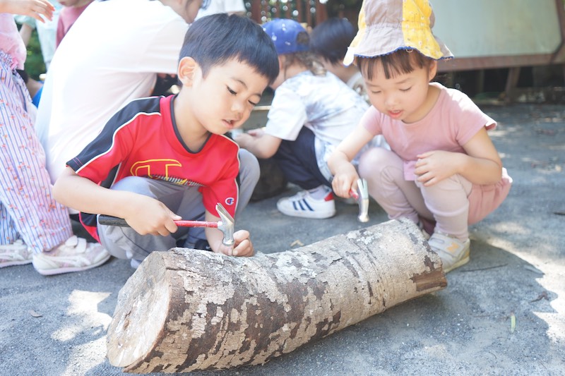 長谷幼稚園では、トンカチを使い園庭に子ども達の世界を広げていく遊びがあります。