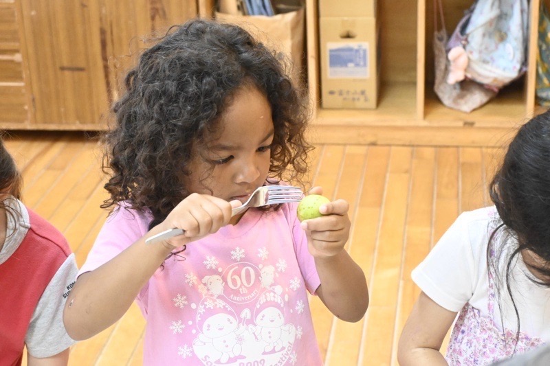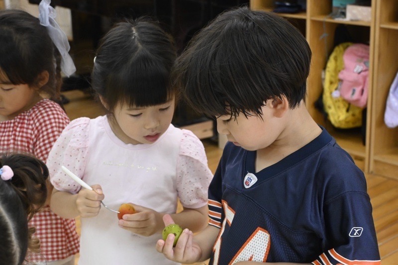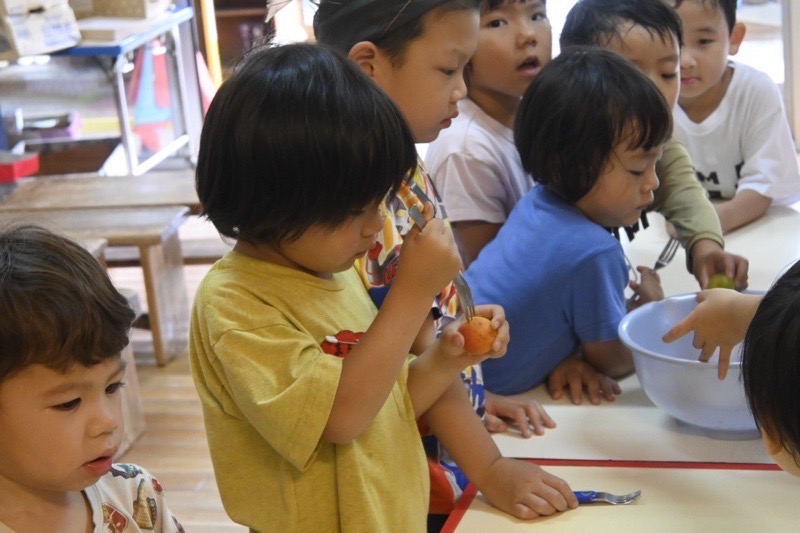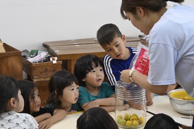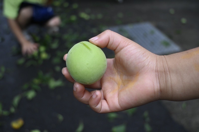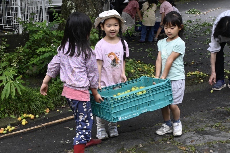 大きく育った梅の実が、雨が降る度にぽとぽと落ちるほど熟してきています。今日はうめとりの日。大人が木から落とした梅をみんなで拾います。