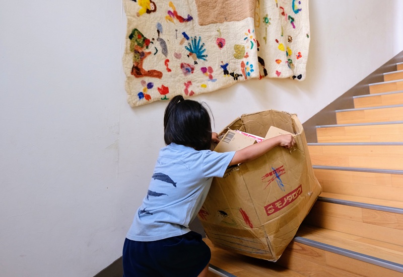 朝の支度を終えると、素材を詰め込んだ大きな段ボールをもって2階へ向かうきいろの子(5歳児)。