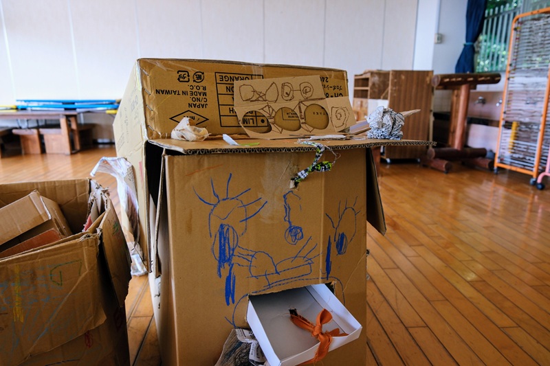 なんと、段ボールを使って『長谷幼稚園』を表現していたのです!帽子も作ってもらい、日差しが強くても子供たちと元気に遊べそうな『長谷幼稚園』。