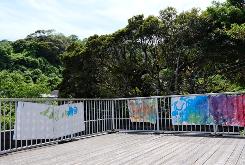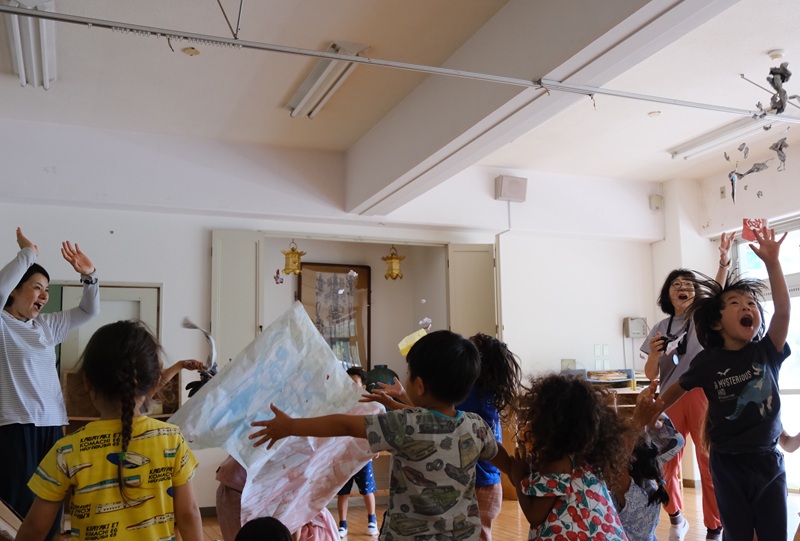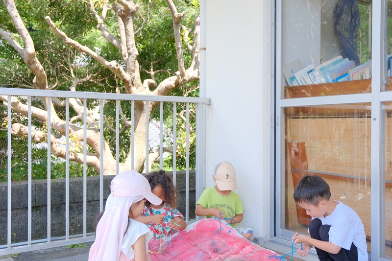テラスでは、鮮やかな色の大きな紙に紐を通しています。強い風が吹くたびに、「こっち抑えててくれるー?」と、協力し合いながら一生懸命な様子。
