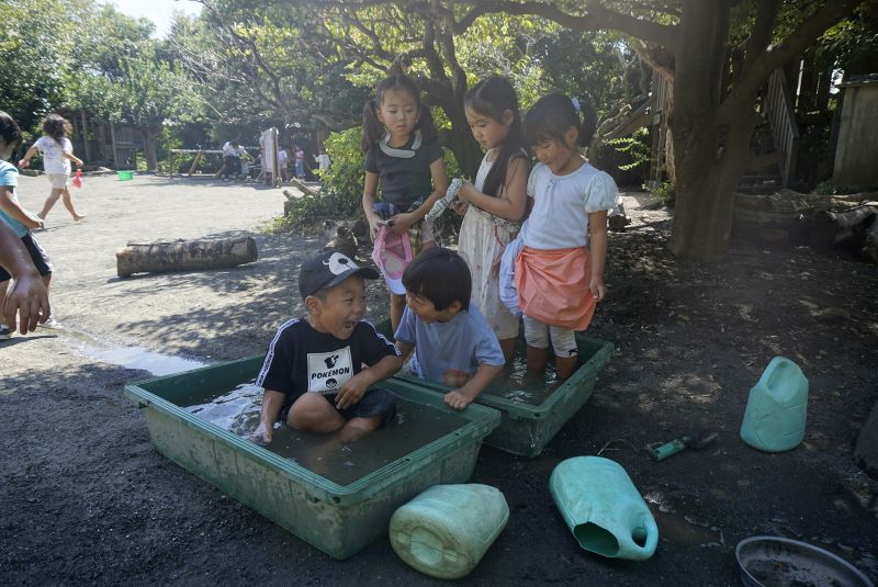 暑かったので足を水に入れて涼んでいたところ、少しバランスを崩してお尻もじゃぽん。ビショビショになってしまい、一瞬どうしよう、という表情を浮かべていましたが「あれ?冷たくて気持ち良い!」と大はしゃぎ。