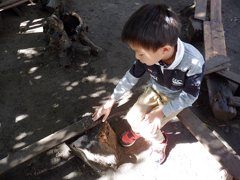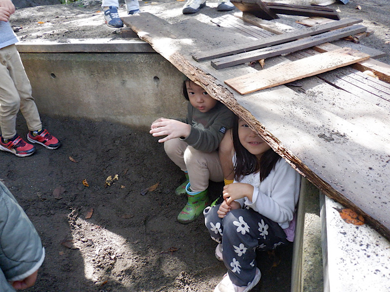 「砂を掘って隠れられるようにしたんだよ」と、きいろの子(5歳児)。