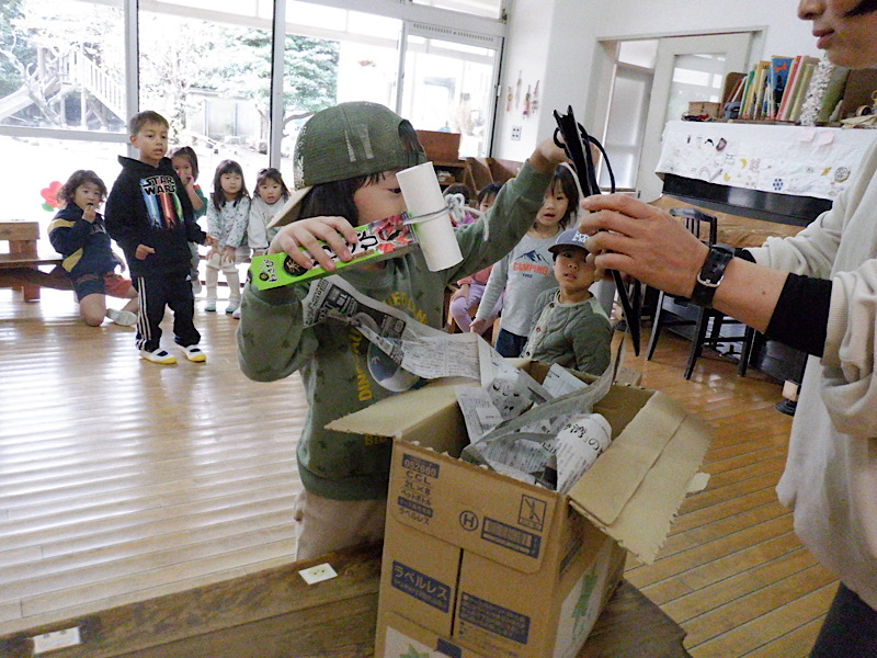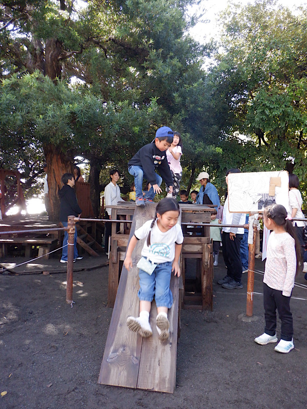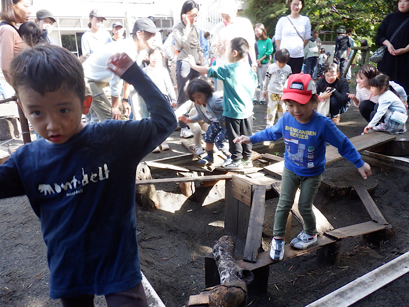 今日は、何日もかけて子どもたちがつくった世界で、保護者と一緒にあそぶ日です。子どもたちの楽しい気持ち、やりたい気持ちがいっぱいにふくらんで、園庭いっぱいに広がっています。
