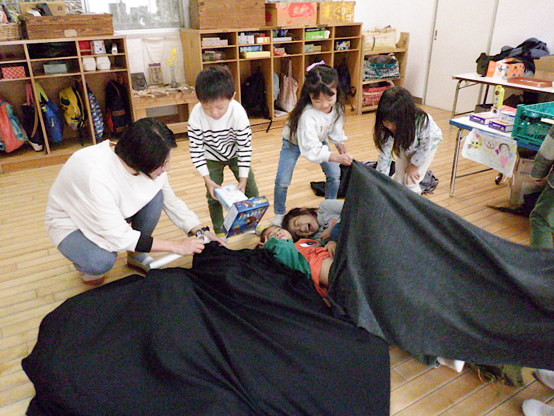 今度は床にゴロンと寝はじめました。何が始まるのかな?大きい布がかぶさったと思ったら、探検隊がやってきました。