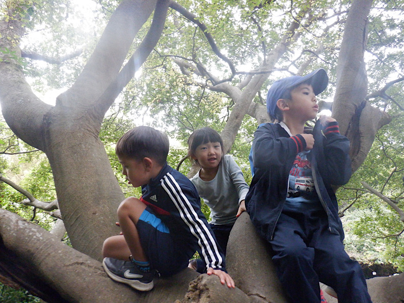 歩いていくと大きな木!一目散に登りに行きます。太い幹が枝分かれしていて、何人でも登れちゃう頼もしい木。なんだか夢が広がるね。