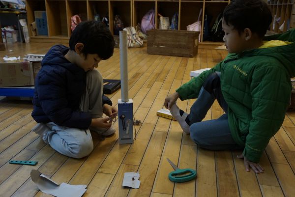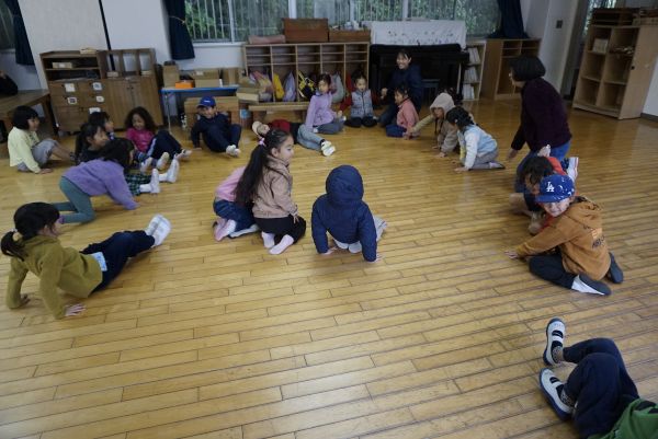 今日はきいろの子(5歳児)が楽しみにしていた芋ほりの日です。リュックを背負って、いざ出発!のタイミングで雨が強まってきてしまい、残念ながら延期になってしまいました。保育者から、「今日は行けなくなってしまったけれど、来週また行くときまでにさつまいもがきっともっともっと大きくなっているよ」というお話を聞いて、残念な気持ちから前向きな気持ちに移っていくきいろの子たちの姿がありました。