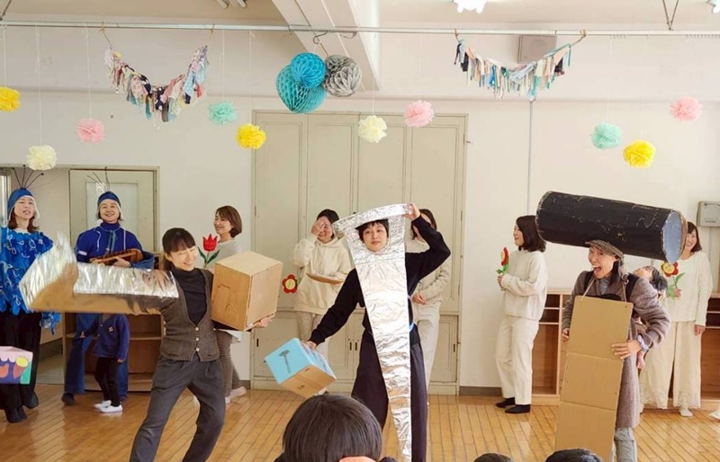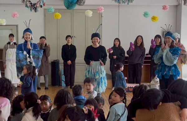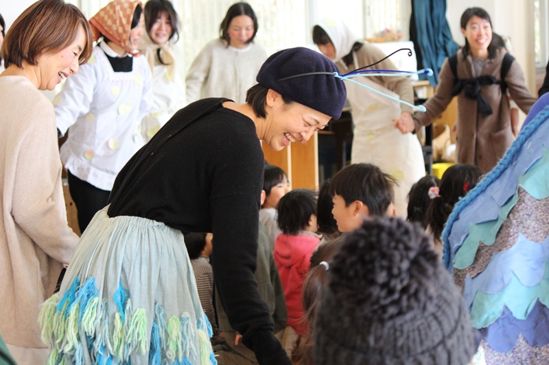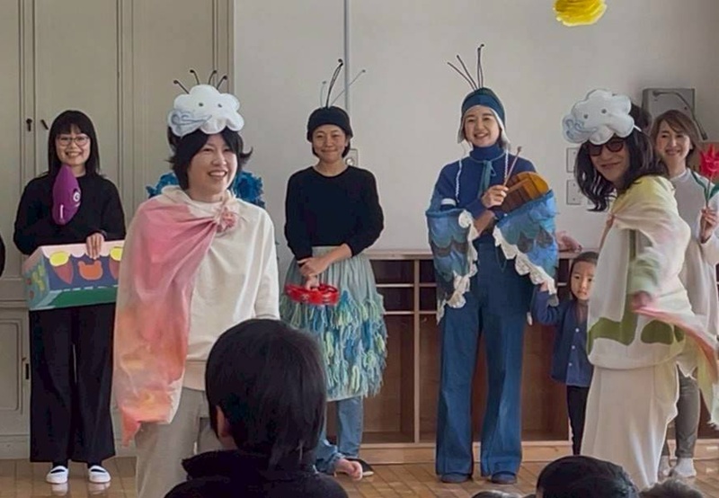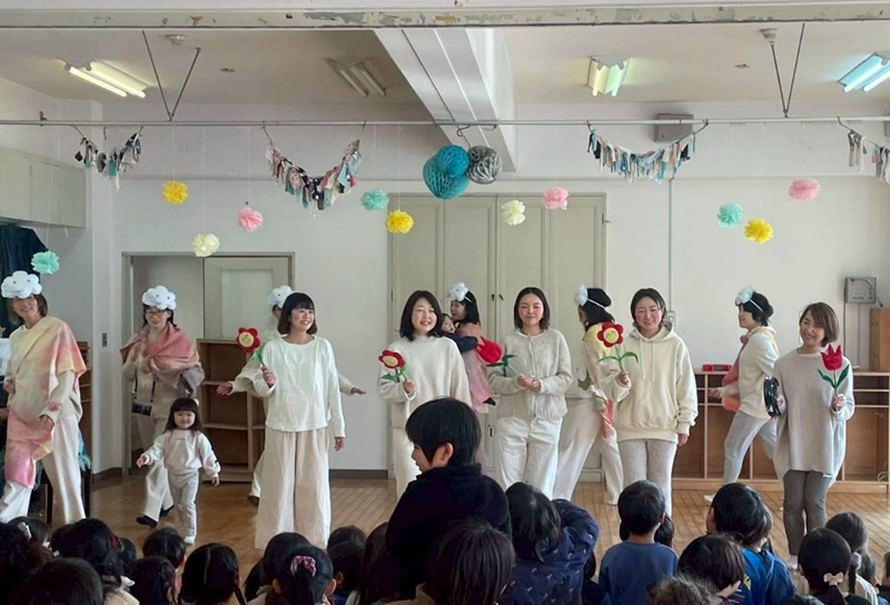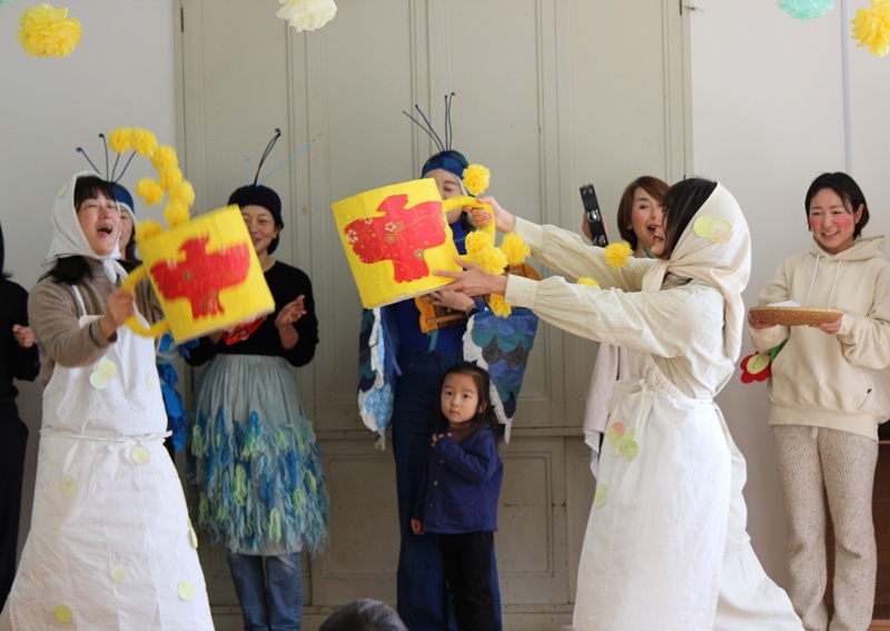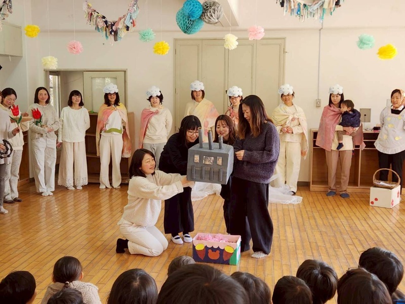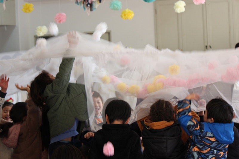 今日はきいろ母さんたちが主催となって、 きいろの子(5歳児)の卒園をお祝いする日です。登園すると「今日は2階のホールでパーティーがあるから、2階に行くのは後でのお楽しみだよね」と、ワクワクしている子どもたちの会話が聞こえてきました。