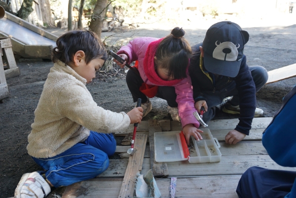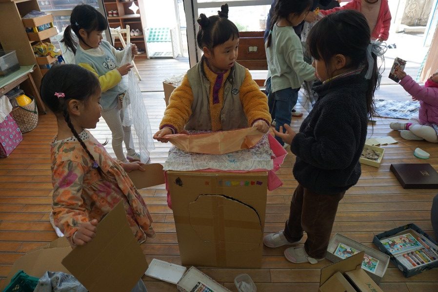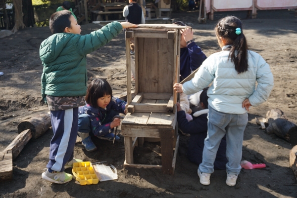 一方、とり組は部屋に集まって、今みんなで園庭に作っている〝はせホテル〟についての話し合いをしていました。