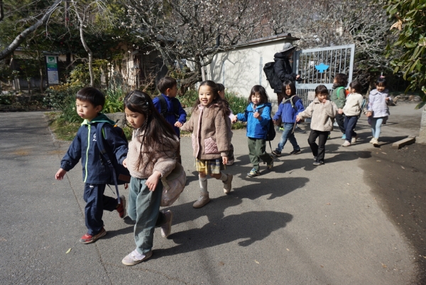 わくわくしながら外に並ぶはせっこたち。クラス毎に手をつないで出発します。