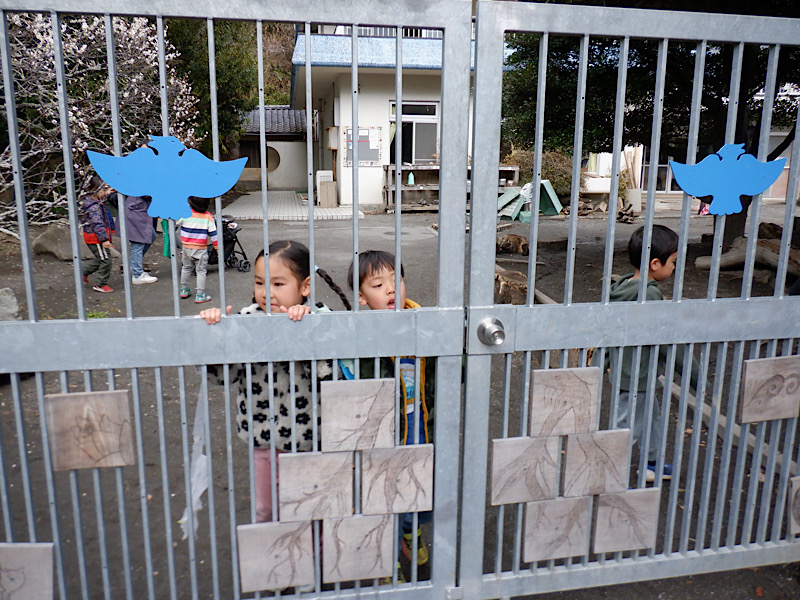 門の前でおうちの人が来るのを心待ちにしています。