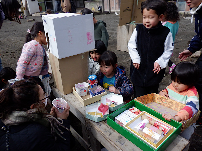 あめ屋さん、あんこ屋さん、ボールすくいゲーム、肉まん屋さん、かき氷屋さん、お寿司屋さんにジュース屋さんまで。見ているだけでワクワクするものばかり。そこに子どもたちの想いも重なります。