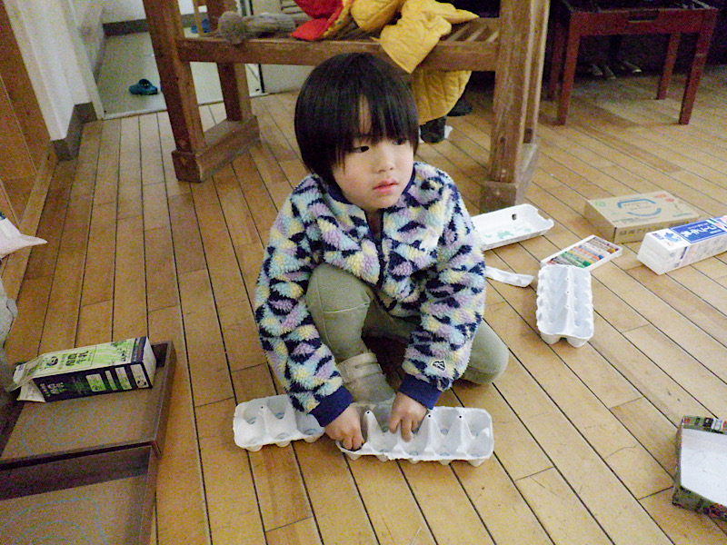 卵パックの底を指でくるくるとこすっているあかの子(3歳児)。「電車の音に聞こえる」と。